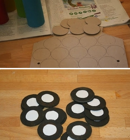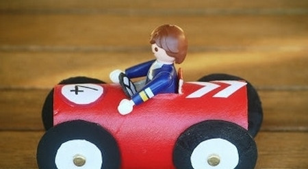 用圖釘把紙筒兩側(cè)的四個(gè)輪子釘住,把駕駛座上的空位挖出來,加上方向盤和擋風(fēng)玻璃。